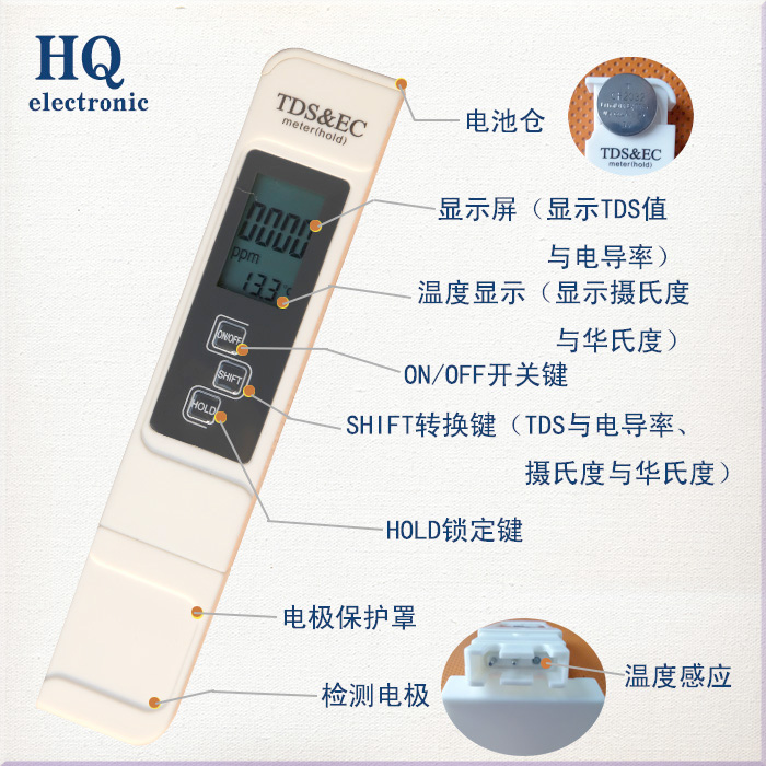 - 3功能合一,檢測TDS值、顯示溫度、檢測電導(dǎo)率