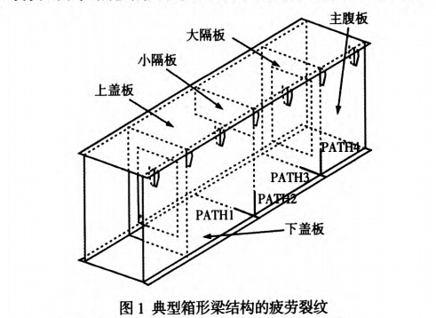 通過對在役橋門式起重機的實際檢測和疲勞試箱形梁結構的高發(fā)性疲勞裂紋,主要發(fā)生在下蓋板與主腹板間的縱向受拉翼緣焊縫和大隔板與主腹板連接焊縫下端的焊趾處,其疲勞裂紋萌生源和擴展機理,如表1所示。]