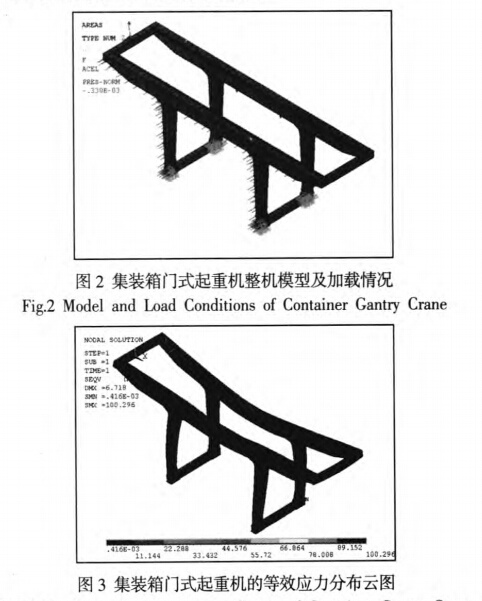 某鐵路局36t集裝箱門式起重機結構主要參數為跨度18m,懸臂長12.5m,小車軸距8.6m。利用ANSYS及其參數化設計語言(APDL),采用sheU63單元,建立起重機整體結構的參數化模型。將小車位于跨中,起升機構滿載提升考慮沖擊載荷)時,作為研究跨間裂紋的最危險工況。同時考慮結構自重、風載、大車運行偏斜側向力等的作用,起重機整機模型及此工況下的加載情況,如圖2所示。在跨中工況下,整機結構的等效應力云圖,如圖3所示。