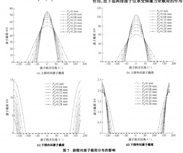 (2)轉盤軸承上部兩排滾子的載荷顯著大于下部兩排滾子的載荷,上排外環滾子的載荷大于上排內環滾子的載荷,下排外環滾子的載荷大于下排內環滾子的載荷。